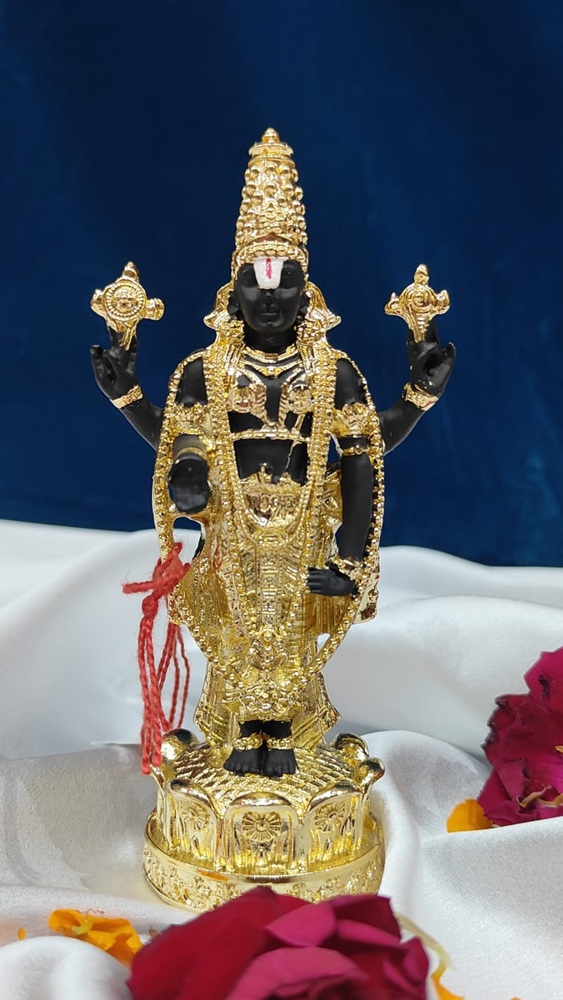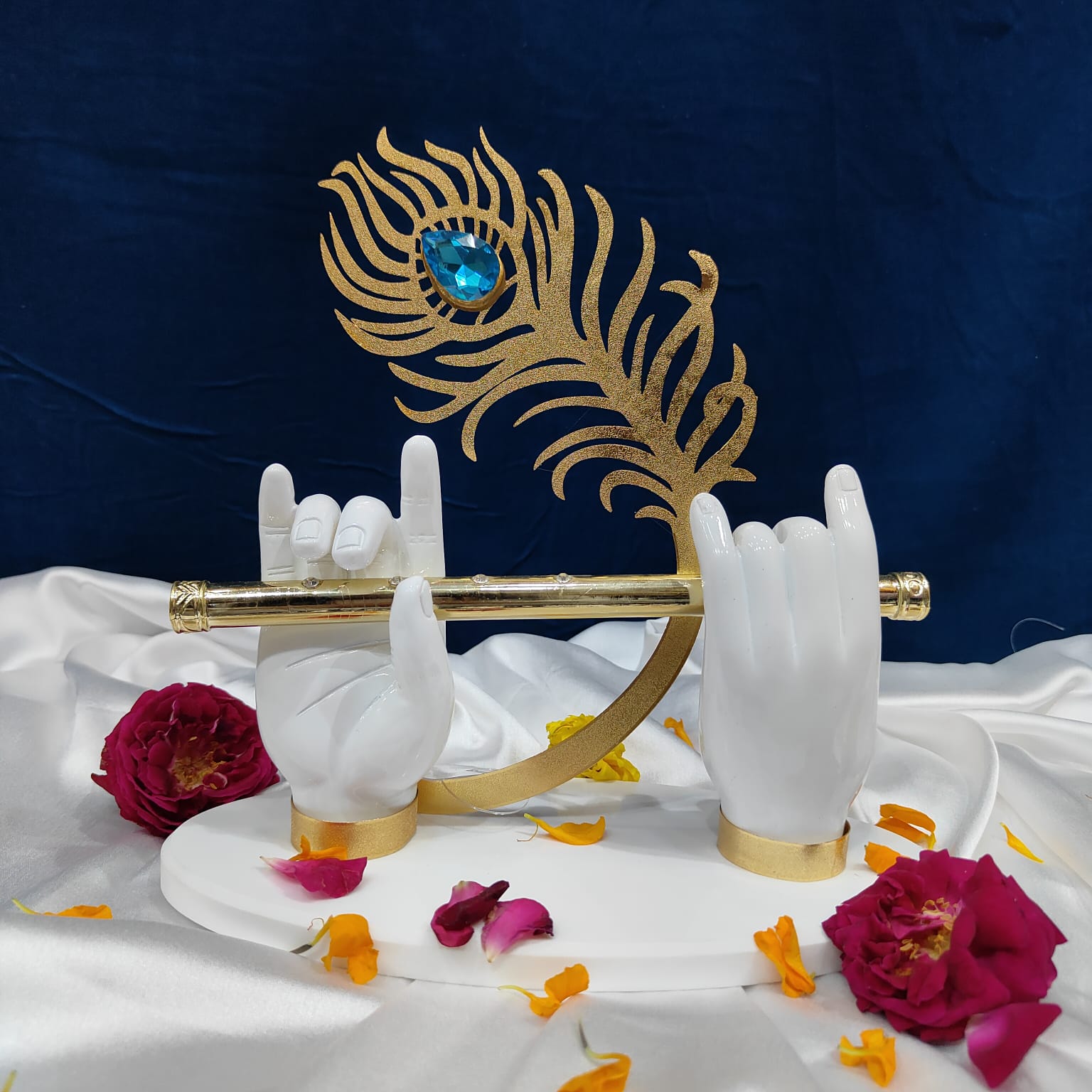 This elegant décor piece features white sculpted hands holding a golden flute, inspired by Lord Krishna’s divine charm. A delicate peacock feather with a blue gem accent adds a royal touch. Perfect for home temples or festive décor, it beautifully blends spirituality, artistry, and modern craftsmanship in a graceful display.